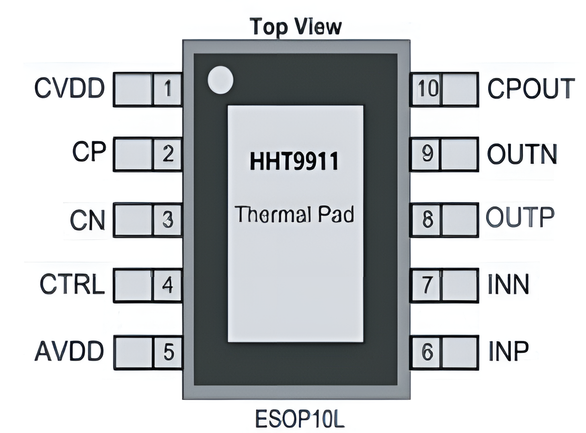 | HHT9911 | チャージポンプ昇圧内蔵モノラル・オーディオパワーアンプ | ● 入力電圧範囲:2.8V~5.5V ● 破れ音防止機能(コンプレッション:-7dB) ● クラスD/クラスAB 切替機能 ● クラスD動作時 最大出力:5.4W ● ESOP-10L パッケージ | ● AIスピーカー ● ポータブルスピーカー ● カード付きスピーカー ● Bluetoothスピーカーなど |
