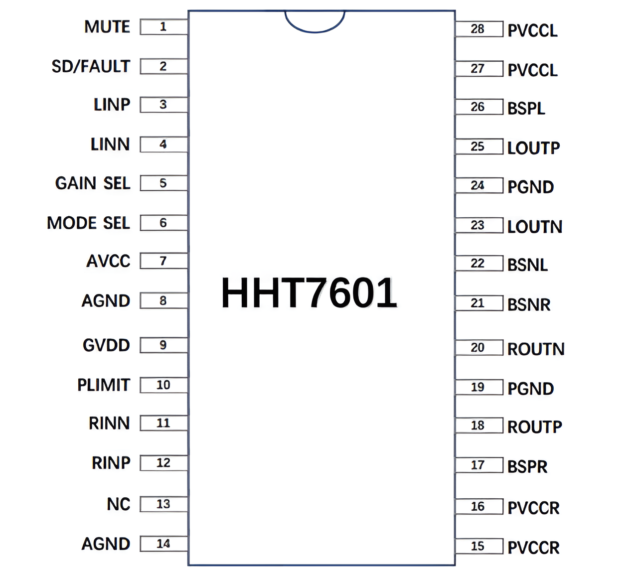 | HHT7601 | モニター入力対応の高効率ステレオクラスDオーディオパワーアンプ | ● 広い電源電圧範囲:5V~20V ● PBTL動作時:60W出力 ● 多段ゲイン設定機能(20dB/26dB/30dB/34dB ● UVP・DCP・OCP・OTP保護機能を内蔵) ● ETSSOP-28L パッケージ | ● 液晶テレビ ● 液晶ディスプレイ ● Bluetoothスピーカー ● Wi-Fiスピーカーなど | |